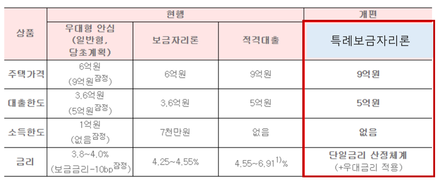 기존 보금자리론 대비지원 대상 (주택가격 6-> 9억 원 이하), 대출한도 (3.6억-> 5억 원)를 확대하고 소득제한(기존 7천만 원 이하) 폐지