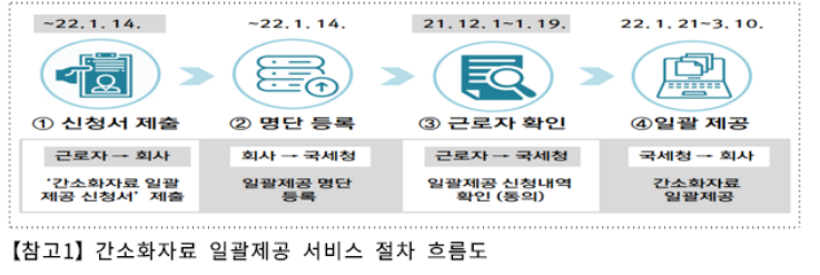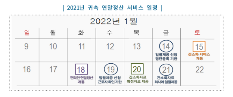 통상 1월 중순 국세청 홈텍스에서 '연말정산 간소화 서비스'를 오픈하면서 시작되어서 1월 20일 전후까지 회사에 자료를 일괄 등록, 제출하는 것으로 마무리 됩니다. (홈텍스에서 환급금도 대략 어느정도인지 조회 가능합니다)