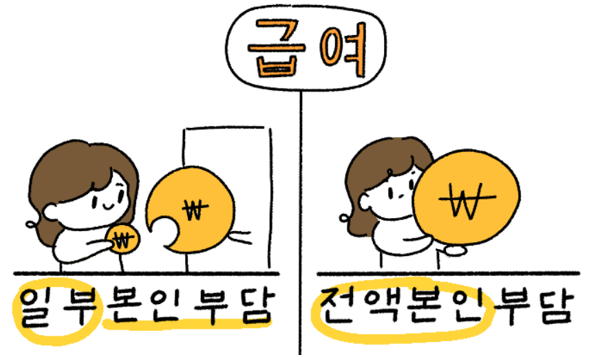 먼저 급여는 건강보험 혜택이 적용되는 진료항목으로 정해진 진료비 중 일부 금액을 환자가 내는 일부 본인부담과 ㅏ정해진 진료비 전체 금액을 환자가 내는 전액본인부담으로 구분됩니다.