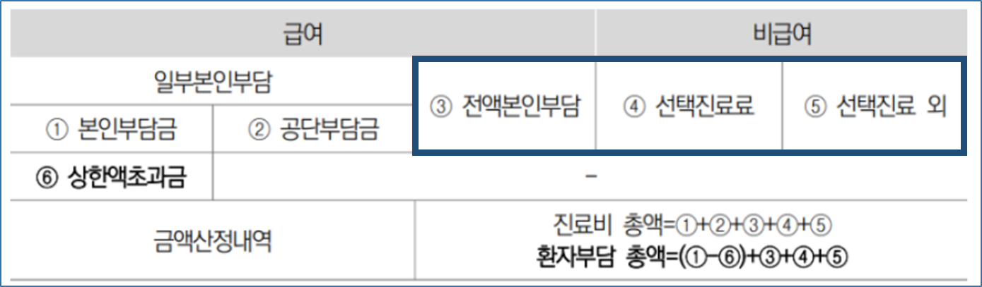 (①본인부담금 - ⑥ 상한액초과액) + ③전액본인부담 + ④선택진료 + ⑤ 선택진료 외