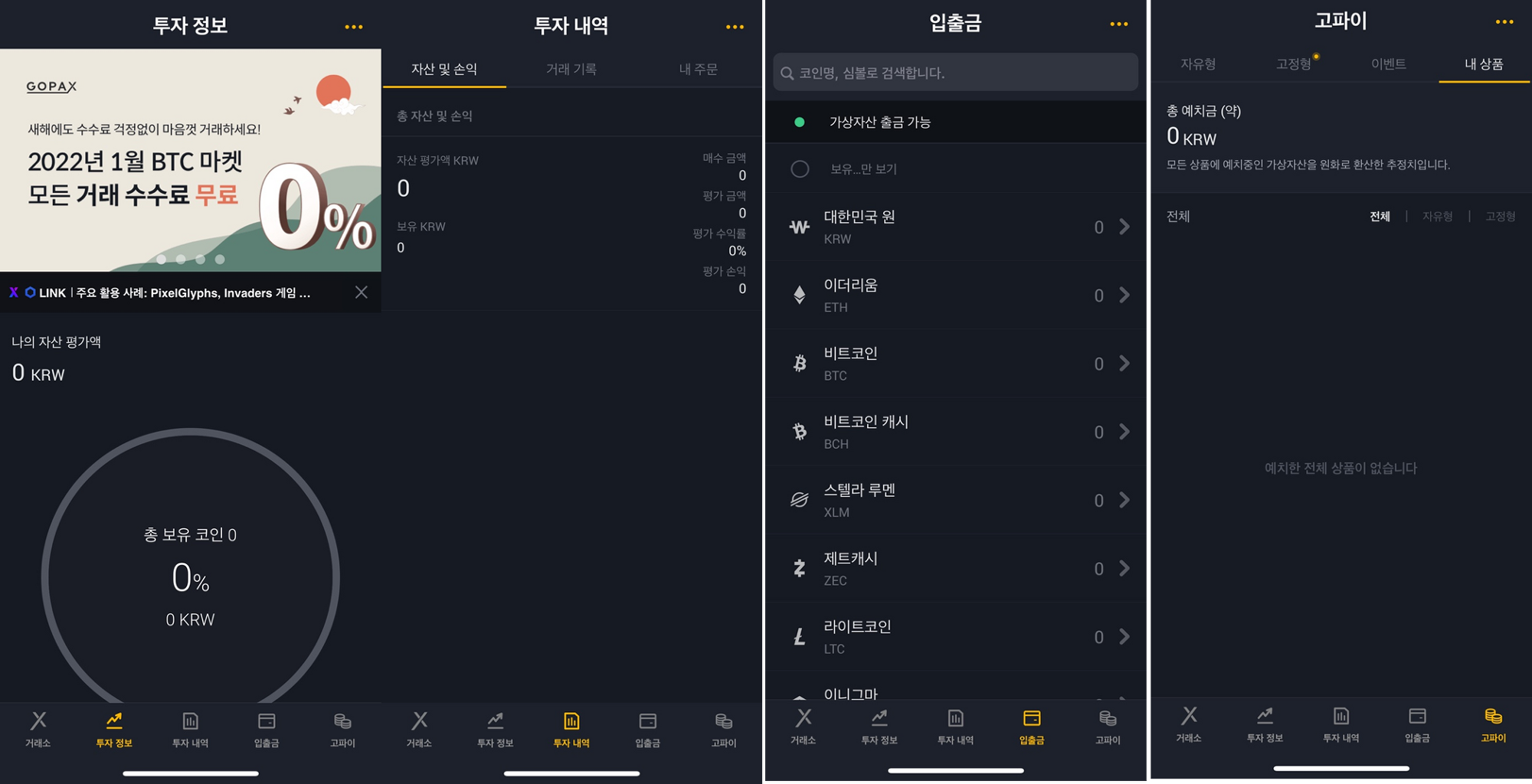 올해 고팍스의 모든 거래 수수료가 0%라는 안내가 보이는데 정말 그런지는 한번 찾아봐야겠습니다. 그외 투자내역, 입출금 (입출금을 원하는 통화로 할 수 있는걸까요?), 고파이 (고팍스 말고 고파이는 또 뭔가요?) 를 한번씩 눌러봤지만 질문에 질문이 더해 집니다.